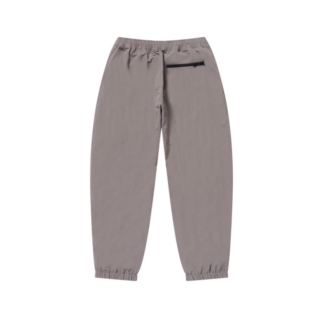 左腿にボディと同系色の "取扱注意" ラベルロゴ・スモールワッペンを配置したトラックパンツ。 撥水加工を施したナイロン素材の生地を使用。 同デザインのトラックジャケットとセットアップで着用可能。