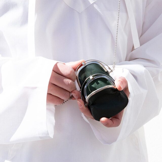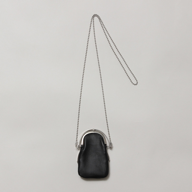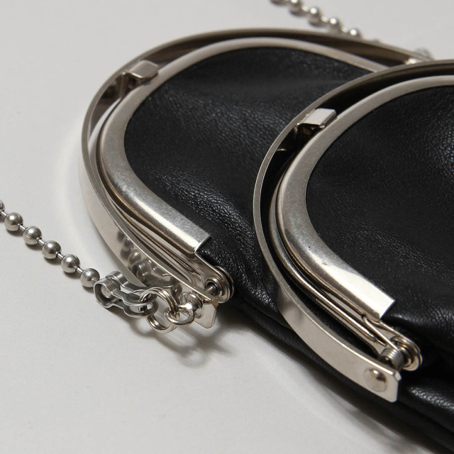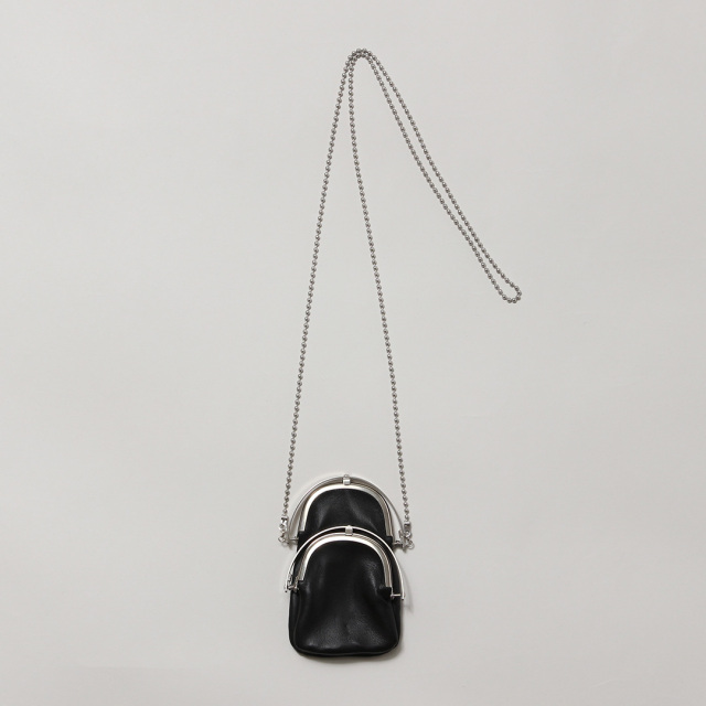 サイズ違いのがま口が2連にデザインされた、チェーンショルダー式ウォレット。