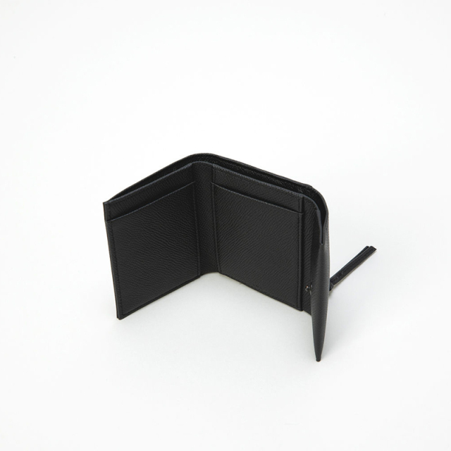 3折りミニ財布でも、容量がある設計にしています。 お札は折らずに入り、カード段2段、カードサイズのフリーポケット2室、マチ付きファスナー式小銭入れ。 小さいながら必要なものを全て収めていただけます。 ファスナー・ホックなどパーツを全てブラックで纏めたシックな表情です。