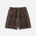Hippopotamusオリジナル製法のコットンとバンブーレーヨン(再生竹繊維)を交織したタオル地をベースに、別注のオリジナルレオパード柄を施したイージーショートパンツ。なめらかな肌ざわりと吸水性、乾きやすさに優れた質の高い素材。リラックス感のある着心地でルームウェアとしての使用も想定。ウエストはドローコード内蔵のゴム仕様。左裾にコラボレーション仕様のブランドタグを配置。脇接ぎにピスネームを付属。