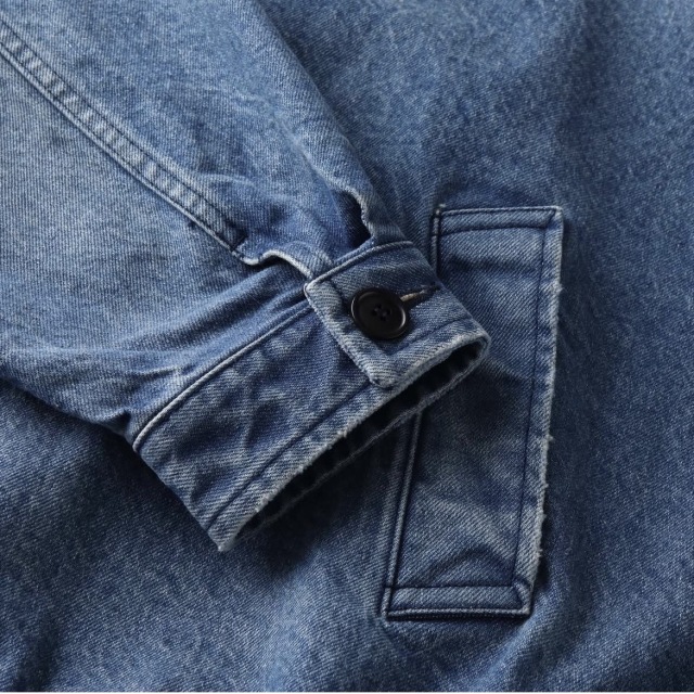 ベーシックブルゾンをオーバーサイズにアレンジしたSFCオリジナルシルエットのデニムジャケット。素材は上質な米綿をもとにブレンドし紡績した、ナチュラルなムラ感の糸で織り上げたデニム生地にエイジング加工を加えております。ピュアインディゴでロープ染色しており、使い込むほどにさらにエイジングが楽しめます。70年代~のデニムに多く見られ、ドライな風合いとシボだったような色落ちが特徴です。生地は全て、染め、織、整理加工ともに福山、井原で作っており、made in 備後の素材になります。