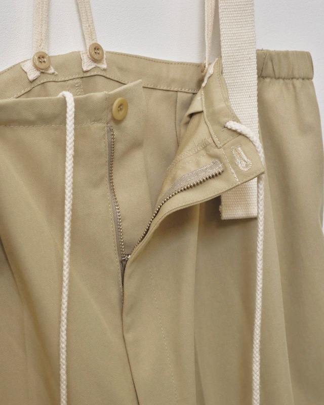 国内の上質なツイル生地を使用したサスペンダーパンツ。深みのあるカラーが特徴で、梳毛のような表情と快適な着心地が魅力。胸下位置のウエストデザインで、両サイドにはゴムをほどこし、ウエストは紐でサイズ調整可能なイージー仕様。裾の太めのロールアップ、センタープレスでマニッシュな雰囲気に仕上げました。取り外しのできるサスペンダーで、様々なトップスとのスタイリングを楽しめる一着です。