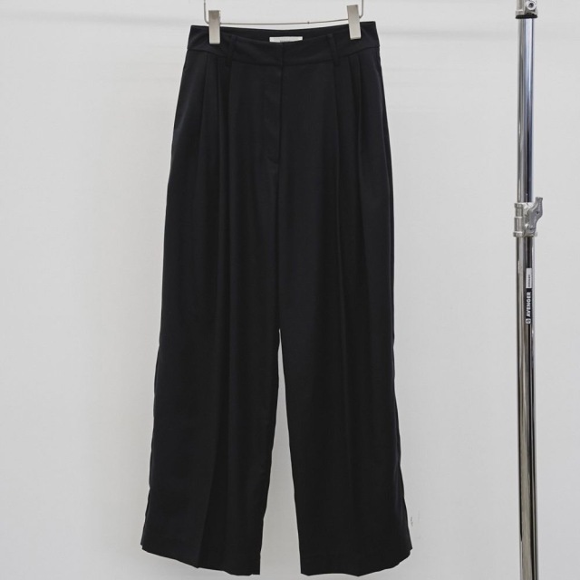 夏場でも涼しく快適に過ごせるトラウザーズ。軽やかな履き心地・落ち感がありながらも、しっかりとシルエットが出る形にこだわりました。タックを3本入れたワイドシルエットです。シンプルなトップスに合わせるだけでマニッシュな印象に。上品な光沢感のある国内のツイル生地を使用。