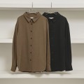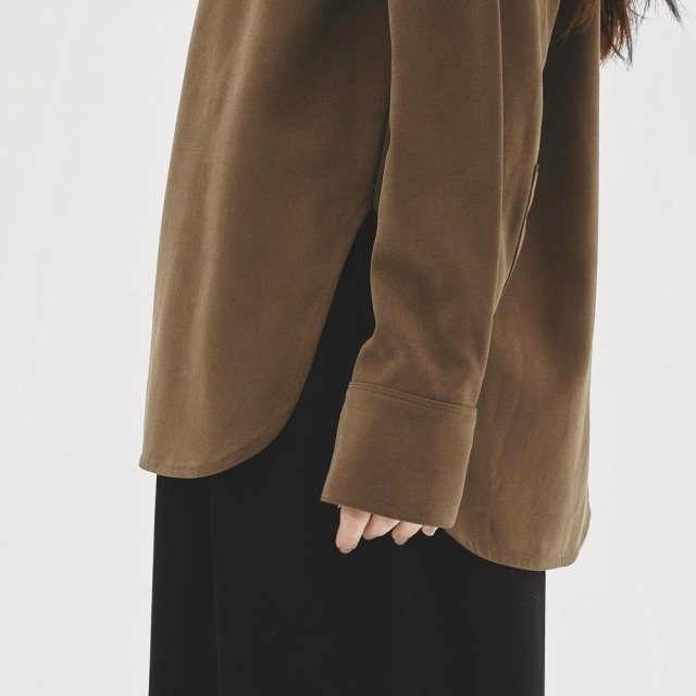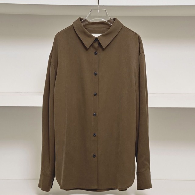 上品な微起毛感のある生地を使用したシャツ。マットで滑らかな質感がミニマルなデザインに上品なニュアンスを与えます。ゆったりとしたシルエットは、一枚で着るのはもちろん、羽織りとしても活躍するアイテムで、ボトムスのシルエットを選ばず、幅広いスタイリングに馴染む一枚です。