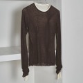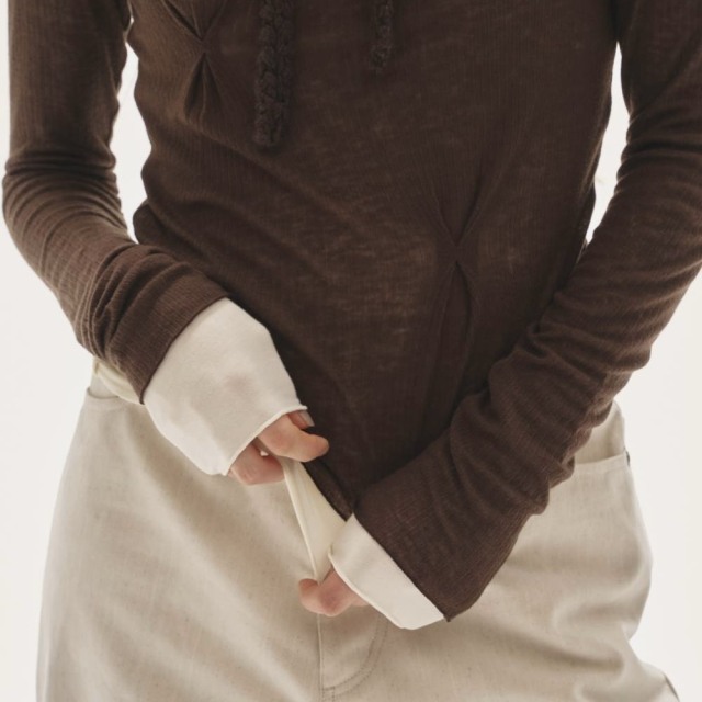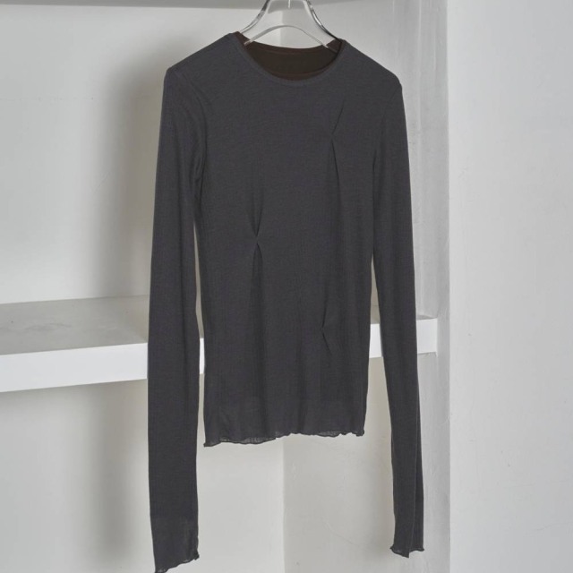 レイヤードデザインが魅力のロングTシャツ。なめらかでしっとりとした肌触りです。やわらかな天竺生地に、ほのかな透け感をもつリブ生地を重ねました。襟元・袖口・裾からのぞく、インナーの配色がスタイリングのアクセントになり、前見頃に施した3か所のつまみディテールがポイントです。