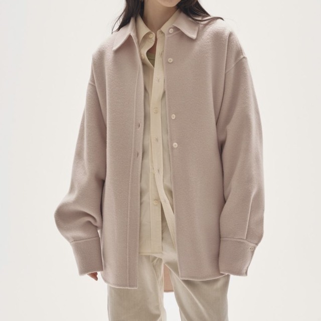 国内で丁寧に織り上げた上質なウールビーバー素材を使用したシャツジャケット。コートの仕立てにも用いられるリバー縫製によって、軽やかでありながら構築的なシルエットを実現。ミニマルなスリットポケットやアシンメトリーなボタン配置が、洗練されたモダンな印象を与えます。シャツのように一枚で着るのはもちろん、羽織としても活躍するアイテムで、カジュアルにも上品なスタイルにも自然に馴染むアイテムです。