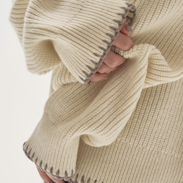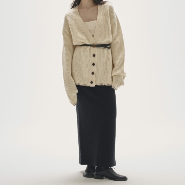 ラムウール混の糸で編み上げたリブニットカーディガン。程良く厚みのある編地が立体的なシルエットを生み、身体を包み込むような柔らかさも魅力。袖口と裾にあしらった繊細なハンドステッチが、控えめながらも印象的なアクセントに。肩のラインが落ちたゆるっとしたサイズは程良く力の抜けた印象で、パンツと合わせたマニッシュな着こなしはもちろん、インナーにビスチェを合わせて肌見せで抜け感をプラスするスタイリングもおすすめです。