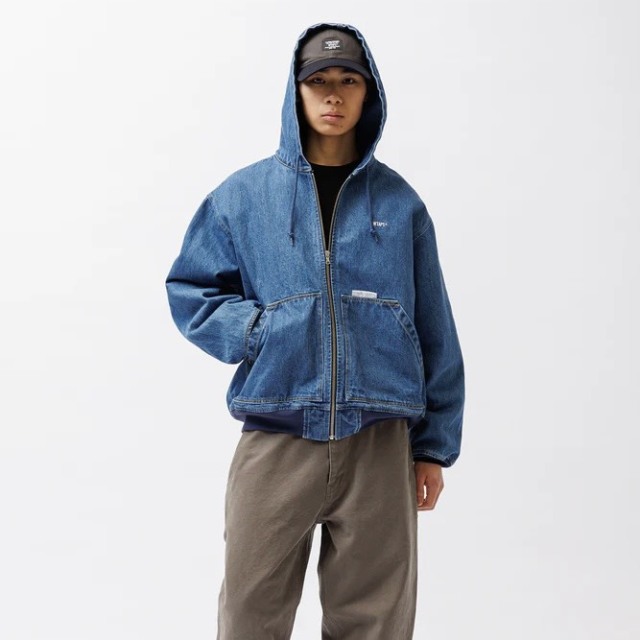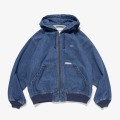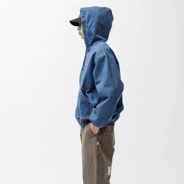 ストーンバイオブリーチ加工を施した14ozデニムのフード付きジップアップジャケット。フロントにパッチポケットを配し、袖口と裾はリブの仕様。左胸に刺繍モチーフを配置。