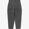 ボールバイオブリーチ加工を施した9ozムラ糸デニムの2タック6ポケットトラウザーズ。アコーディオン型のカーゴポケットの右側に両端の斜線でサイズを表記するプリントネームを付属。ややテーパードしたワイドシルエット。